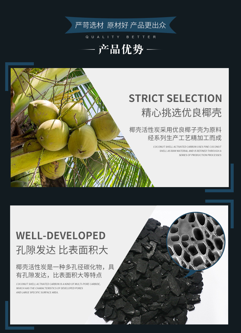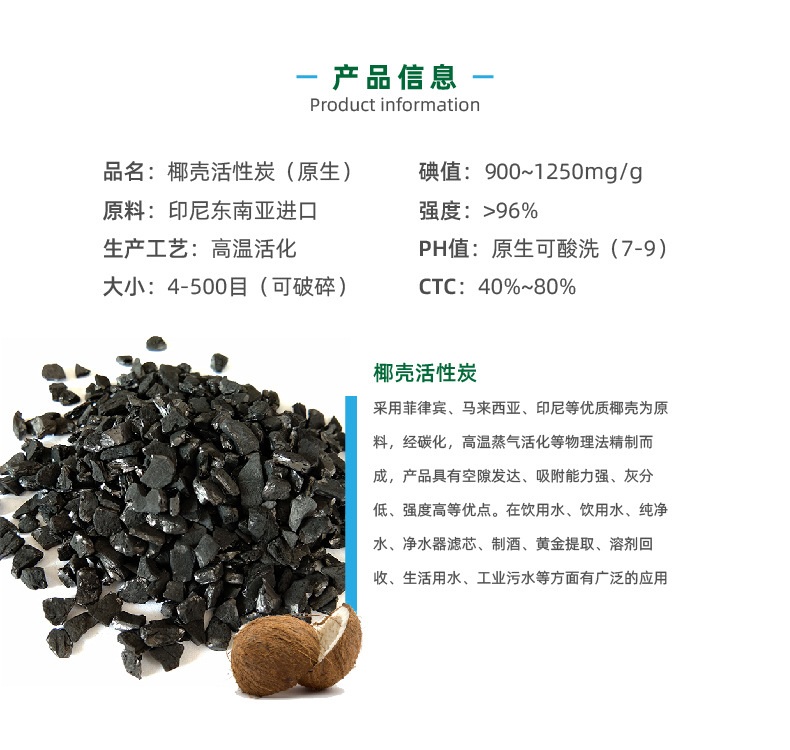 椰殼活性炭,采用菲律賓、馬來西亞、印尼等優(yōu)質(zhì)椰子殼為原料,經(jīng)碳化、高溫蒸氣活化等系列物理法生產(chǎn)工藝精加工而成。椰殼活性炭外觀為黑色,顆粒狀,具有孔隙發(fā)達(dá)、吸附性能好、強(qiáng)度高、易再生、經(jīng)濟(jì)耐用等優(yōu)點(diǎn),但是因?yàn)橐瑲ぎa(chǎn)地等問題,價格高于常規(guī)木質(zhì)活性炭。